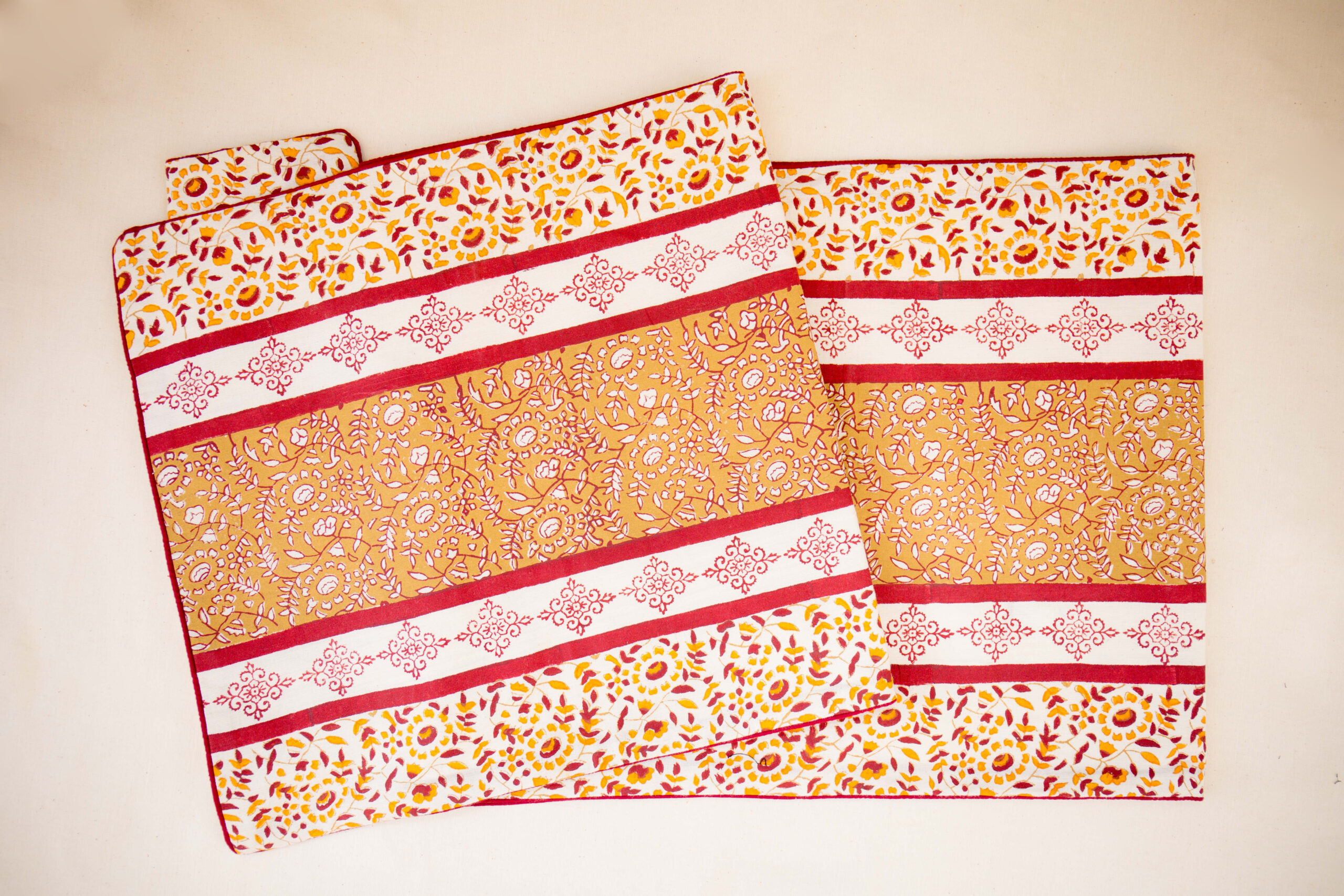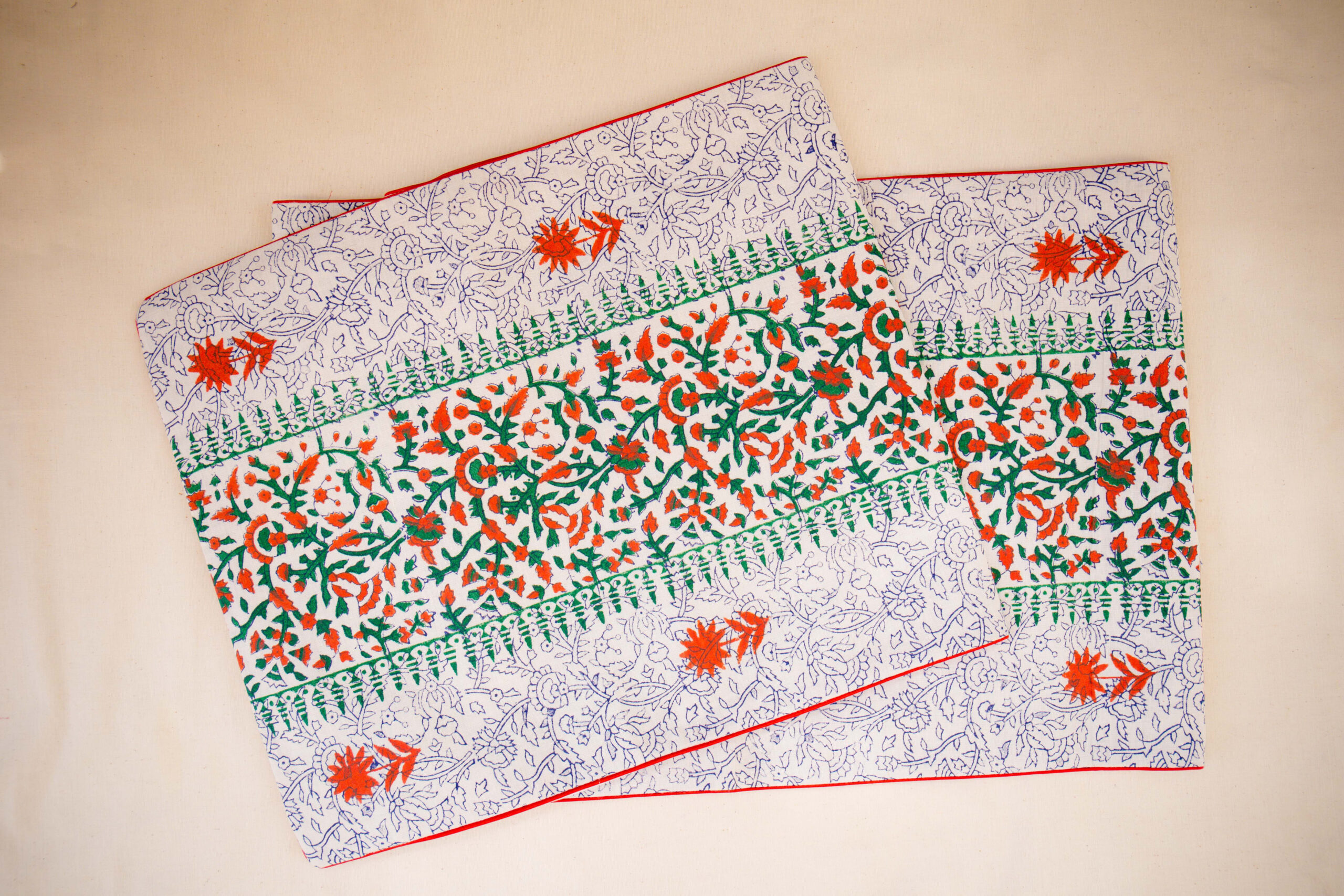Runner with blockprint and rilli in cotton. Size: 80″x18″ Dry clean only.