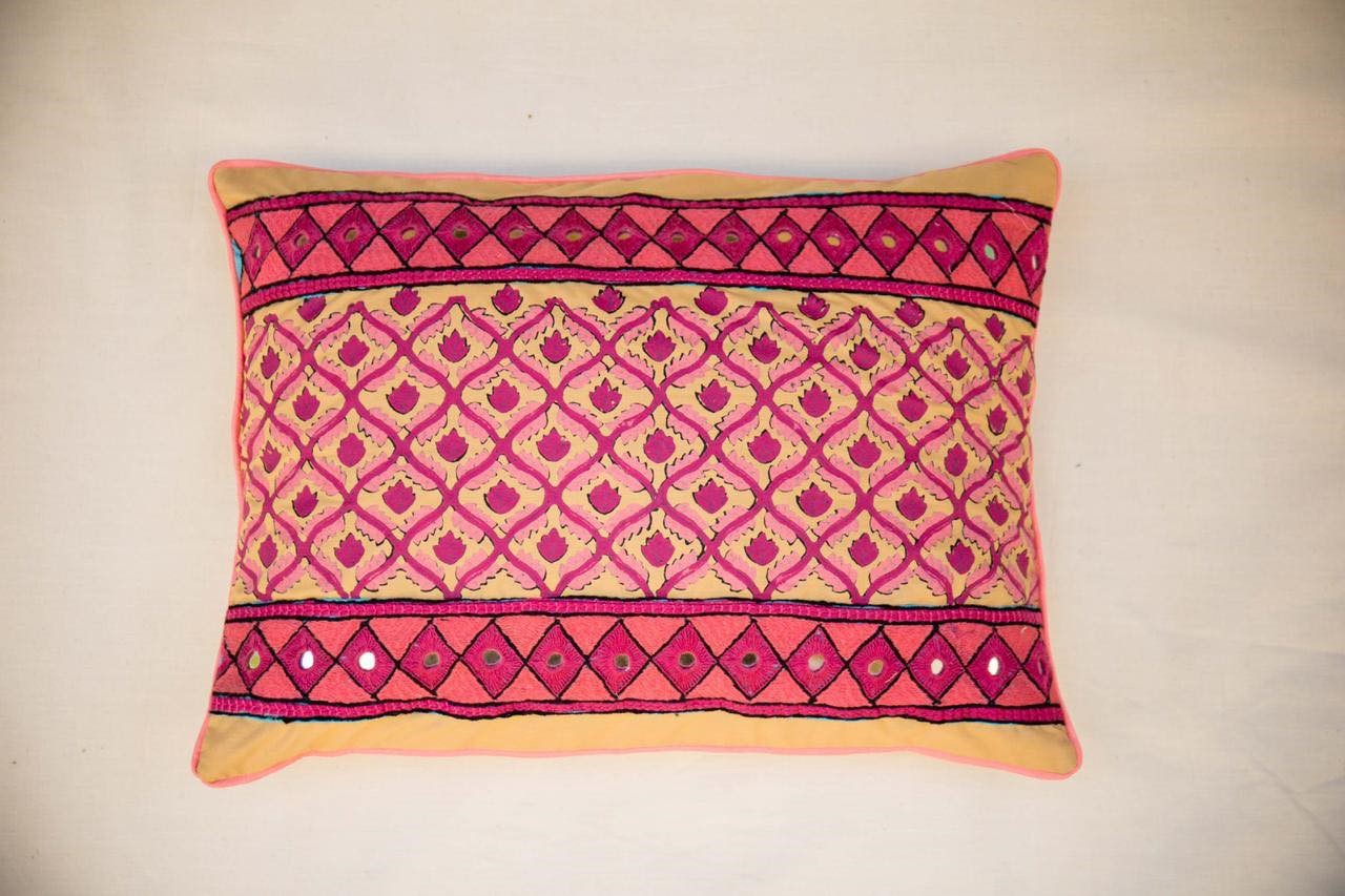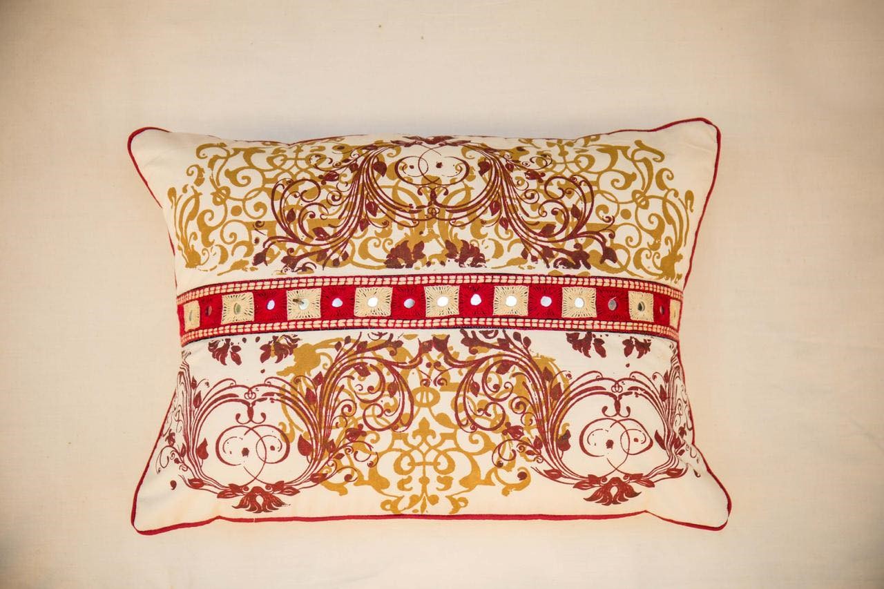 Blockprinted cushion with an embroidered lace.