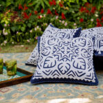 Golden base with cream rilli. Size: 16” x 16”. Pure cotton.