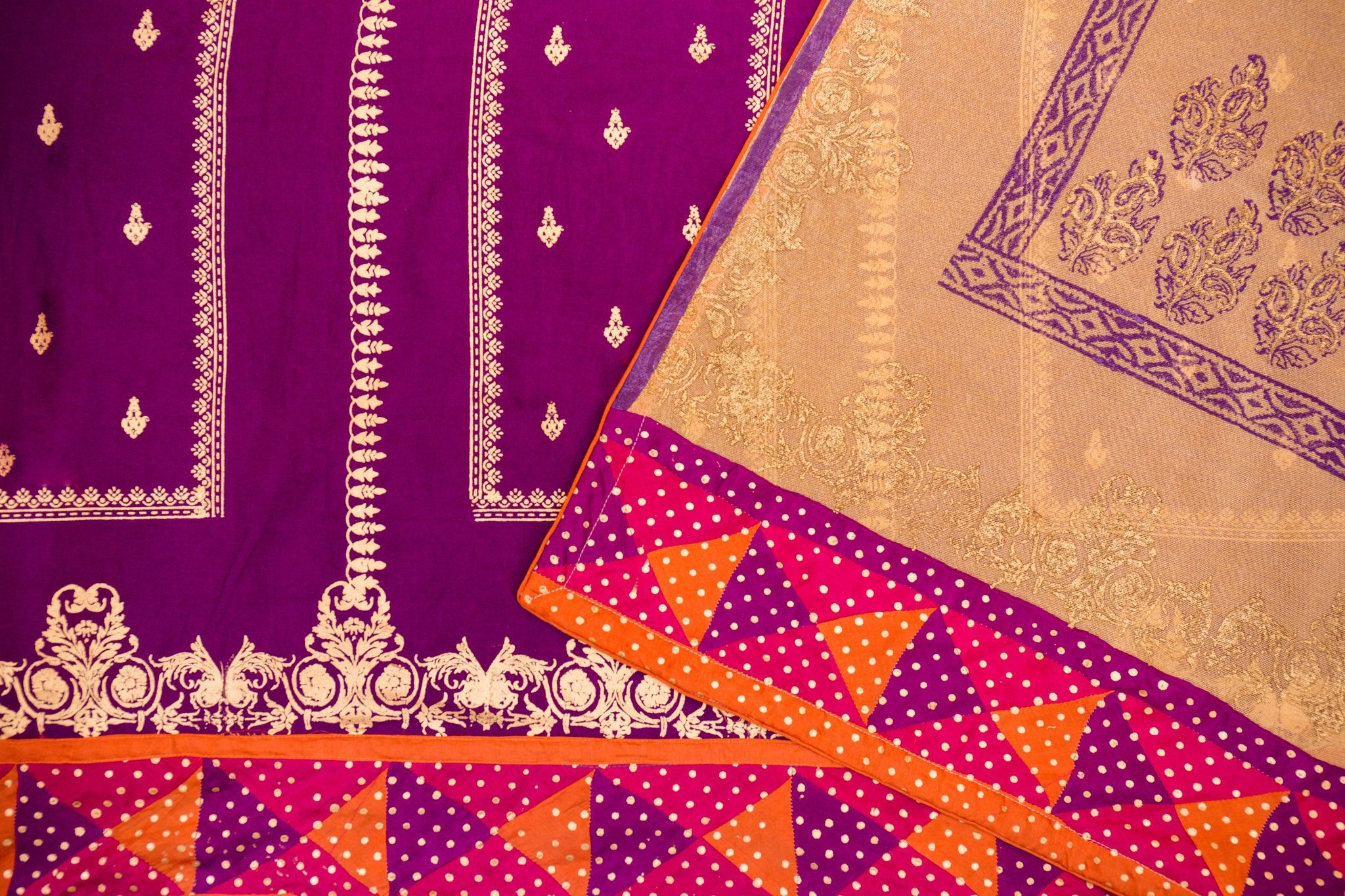 Purple khaadi silk with blockprint and chattapatti detailing coupled with a blockprinted khaadi net dupatta with matching finishing.
